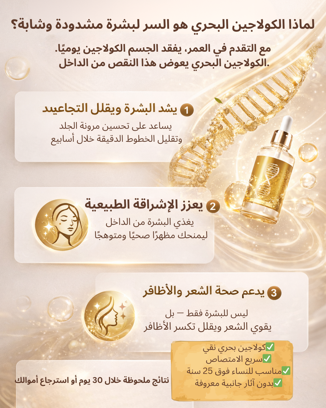 يساعد الكولاجين البحري على تقليل الخطوط الدقيقة واستعادة مرونة البشرة ومنحها مظهراً أكثر شباباً.